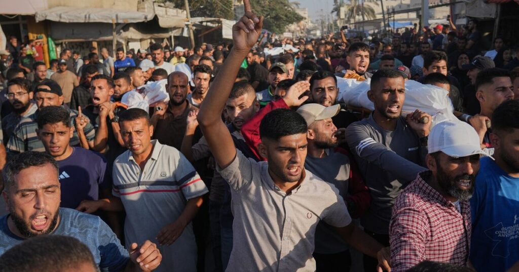 Funeral services were held Monday for some of the dozens of people killed earlier by Israeli strikes across the strip. Associated Press footage showed mourners lining up for funeral prayers behind bodies draped in white sheets.